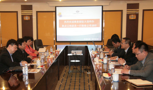 梁永岑對單慶江一行的到訪表示歡迎,對商務部駐大連特辦長期以來給予大連公司的支持幫助表示感謝,并向客人詳細介紹了大連公司的歷史沿革、發展歷程、組織架構、近年來主要業績,特別是在金融危機爆發以來,大連公司在調整產業機構、創新發展模式方面所取得的成績。他表示,大連公司將進一步加強經貿發展,加快產品結構和市場結構調整,加大進出口貿易、國際工程承攬、準金融等服務領域的開發力度,實現轉型發展。